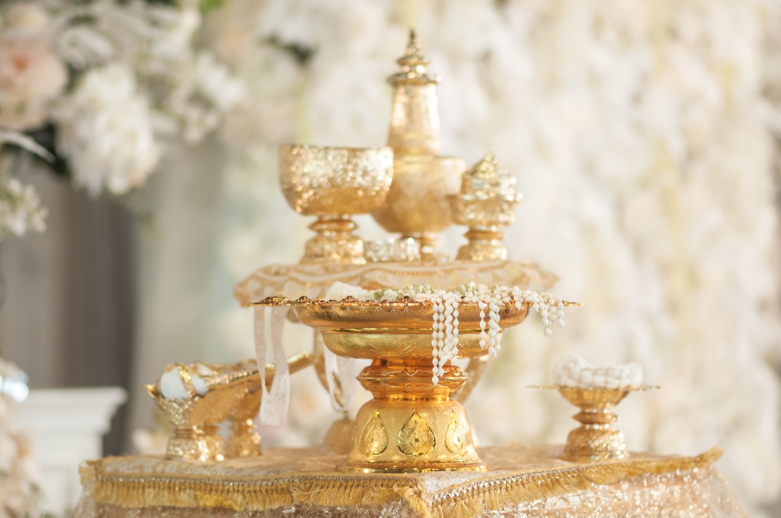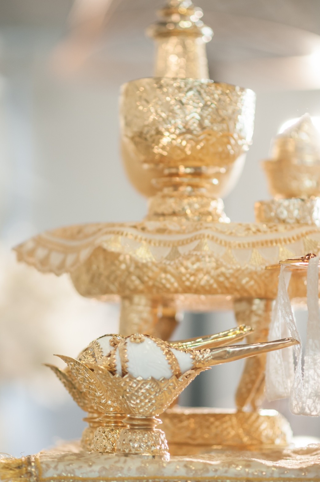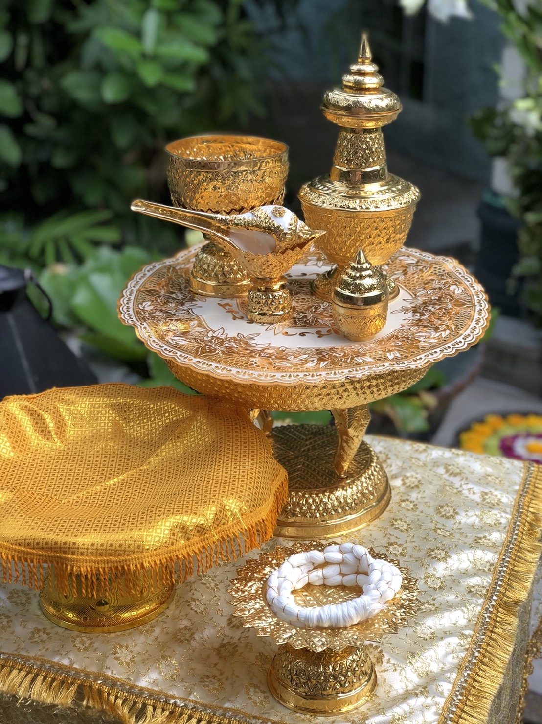 เช่าอุปกรณ์สำหรับพิธีหลั่งน้ำพระพุทธมนต์ครบชุด7ชิ้น สีครีมทอง 2,000บาท