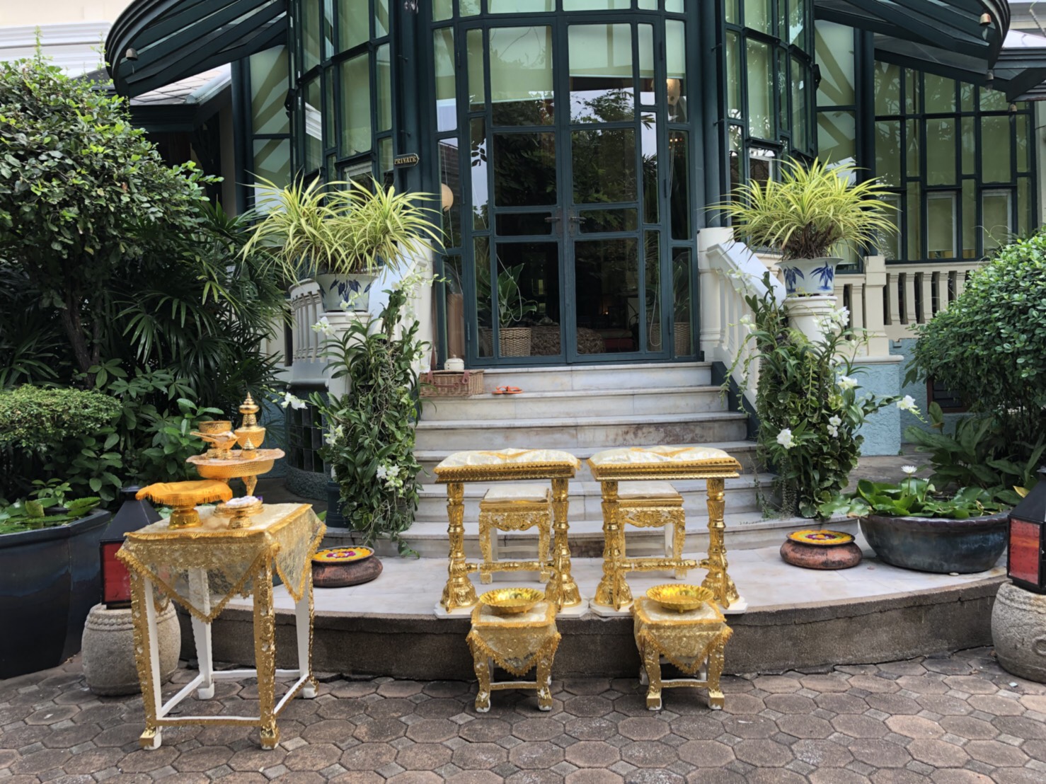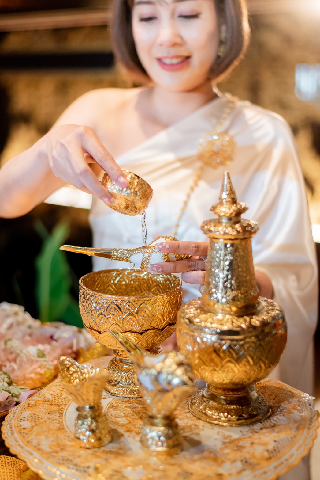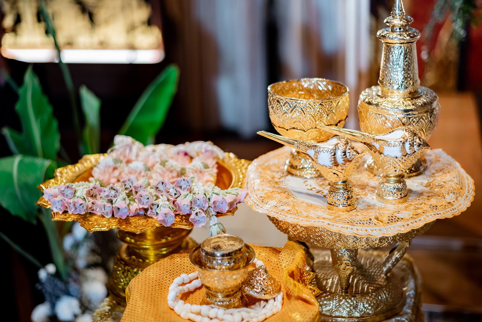 เช่าอุปกรณ์สำหรับพิธีหลั่งน้ำพระพุทธมนต์ครบชุด7ชิ้น สีครีมทอง 2,000บาท